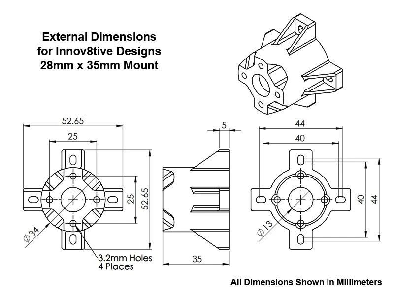The 28mm Series mounts were designed to fit the BadAss series 28mm motors and feature a 25x25mm mounting hole pattern. The design of these mounts includes angled cutouts that line up with the air hole exits on the back side of the motor for good cooling air flow. These mounts will also work with other brands of motors with 28 to 30mm stators that have a 25x25mm mounting hole pattern, such as Cobra, Tempest and most other popular brands. The slotted holes in the base of the mount feature the same spacing as the cross mounts that come with the BadAss 28mm motors and will accommodate screw hole spacing between 40 and 44mm.