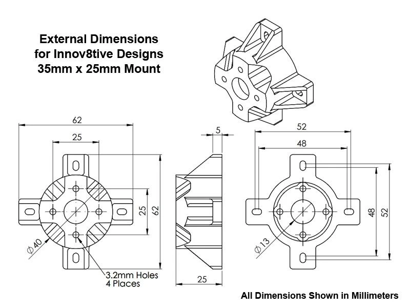 The 35mm Series mounts were designed to fit the BadAss series 35mm motors and feature a 25x25mm mounting hole pattern. The design of these mounts includes angled cutouts that line up with the air hole exits on the back side of the motor for good cooling air flow. These mounts will also work with other brands of motors with 32 to 36mm stators that have a 25x25mm mounting hole pattern, such as Cobra, Tempest and most other popular brands. The slotted holes in the base of the mount feature the same spacing as the cross mounts that come with the BadAss 35mm motors and will accommodate screw hole spacing between 48 and 52mm.