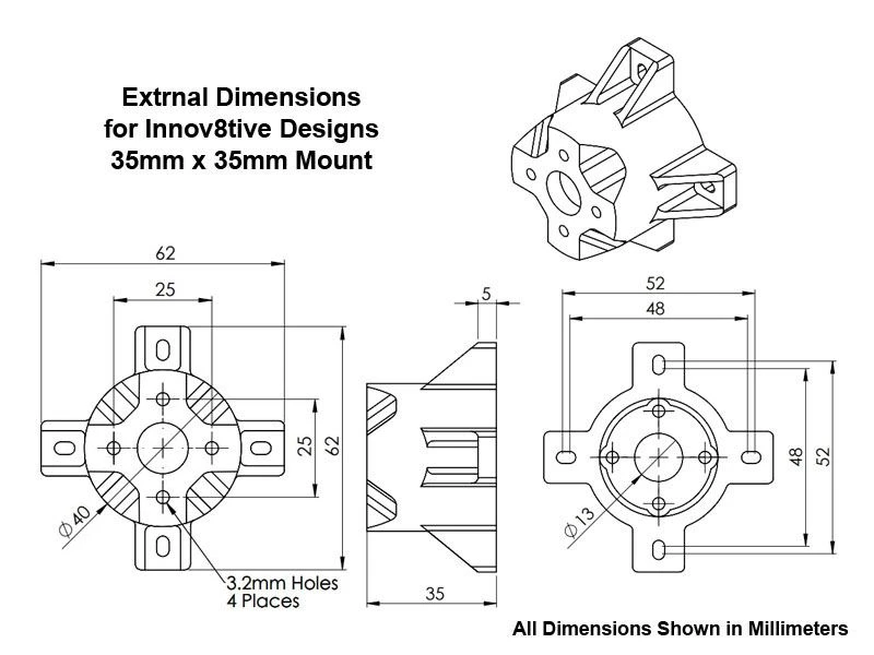 The 35mm Series mounts were designed to fit the BadAss series 35mm motors and feature a 25x25mm mounting hole pattern. The design of these mounts includes angled cutouts that line up with the air hole exits on the back side of the motor for good cooling air flow. These mounts will also work with other brands of motors with 32 to 36mm stators that have a 25x25mm mounting hole pattern, such as Cobra, Tempest and most other popular brands. The slotted holes in the base of the mount feature the same spacing as the cross mounts that come with the BadAss 35mm motors and will accommodate screw hole spacing between 48 and 52mm.