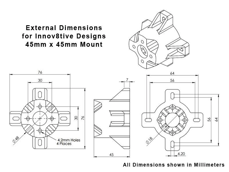 The 45mm Series mounts were designed to fit the BadAss series 45mm motors and feature a 30x30mm mounting hole pattern. The design of these mounts includes angled cutouts that line up with the air hole exits on the back side of the motor for good cooling air flow. These mounts will also work with other brands of motors with 40 to 45mm stators that have a 30x30mm mm mounting hole pattern, such as Tempest, Cobra and most other popular brands. The slotted holes in the base of the mount will accommodate screw hole spacing between 56 and 64mm.