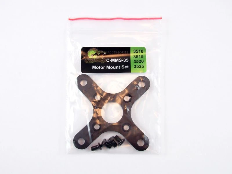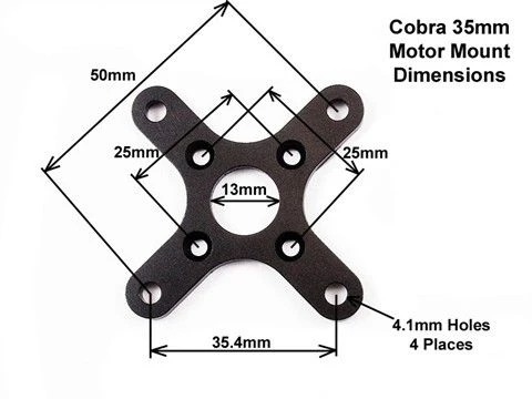 The Cobra 35mm Cross Style motor mount is stamped from high strength 3mm thick aluminum sheet stock and together with the 4 motor screws it weighs 8.5 grams.