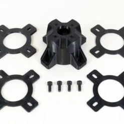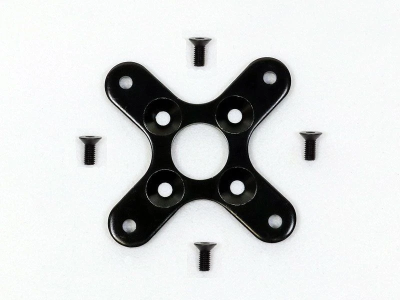 The Tempest 35mm Cross Style motor mount is stamped from high strength 3mm thick aluminum sheet stock and together with the 4 motor screws it weighs 9.6 grams.